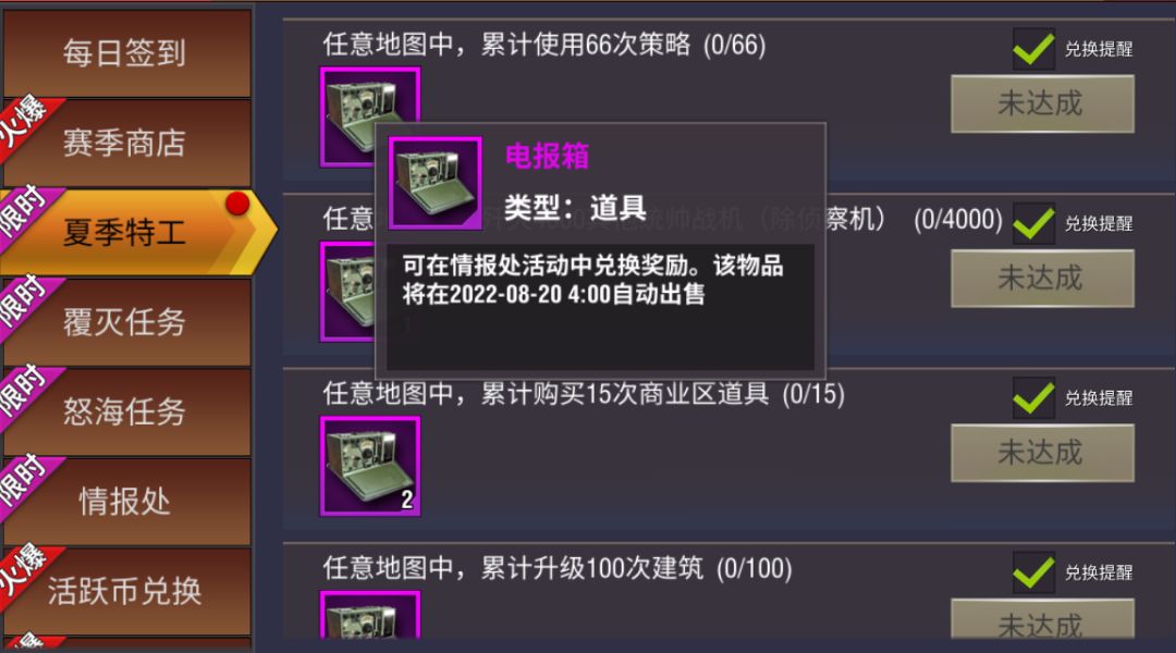 活动时间:8月2日4:00 - 8月20日4:00活动期间,将推出战场特定任务,完成任务可以获得特定道具:电报箱!本活动任务可以参与任意地图完成。