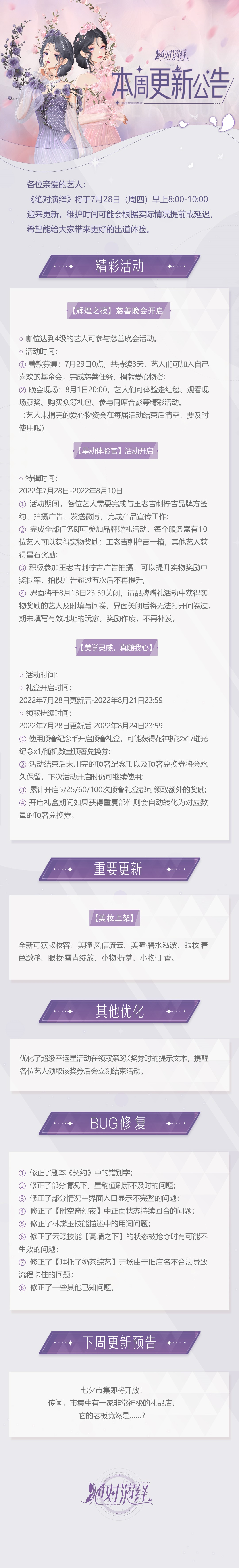 《绝对演绎》将于7月28日(周四)早上8:00-10:00迎来更新,维护时间可能会根据实际情况提前或延迟,希望能给大家带来更好的出道体验。
