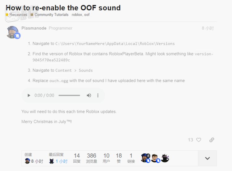 在Roblox的开发者论坛,几位玩家发帖给出了在自己的设备上重新启用Oof音效的方案,只需找到对应的文件位置,用Oof文件替换掉即可。不过包括这些帖子在内,所有讨论Oof音效的帖子都被举报并隐藏,原因不明。