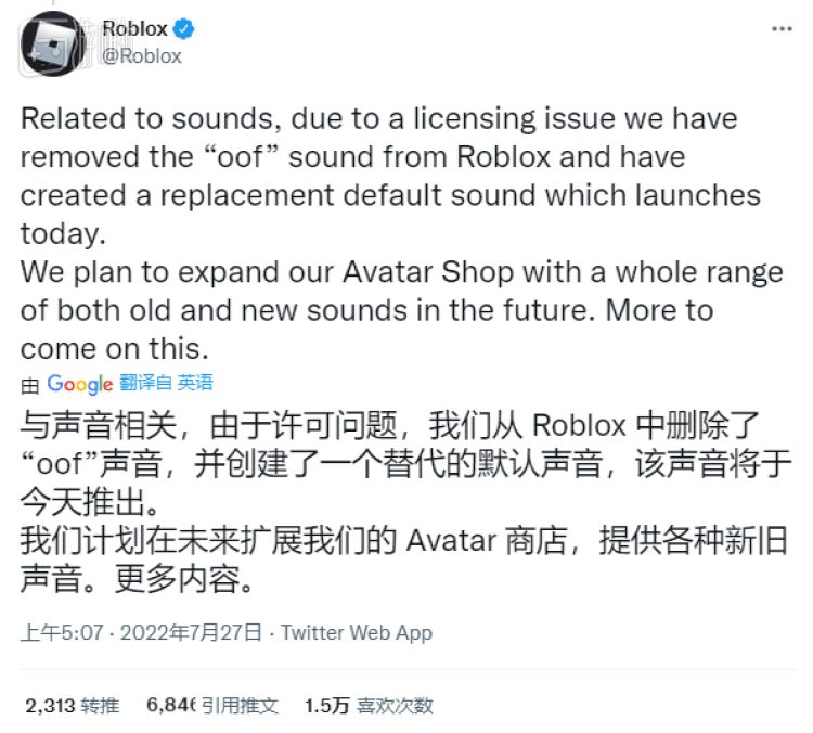 7月27日,Roblox官方推特公布了一些更新组件商店的计划,顺带发布了一则声明。声明表示,因为一些“许可问题”,官方移除了游戏中的Oof音效,还在与声明同步上线的版本更新中,使用新的音效予以替换。