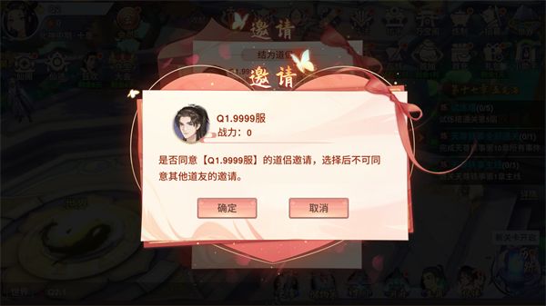 道友需在道侣界面邀请道侣,等待对方同意后,完成情比金坚任务即可成为凡人世界里真正意义上的道侣!