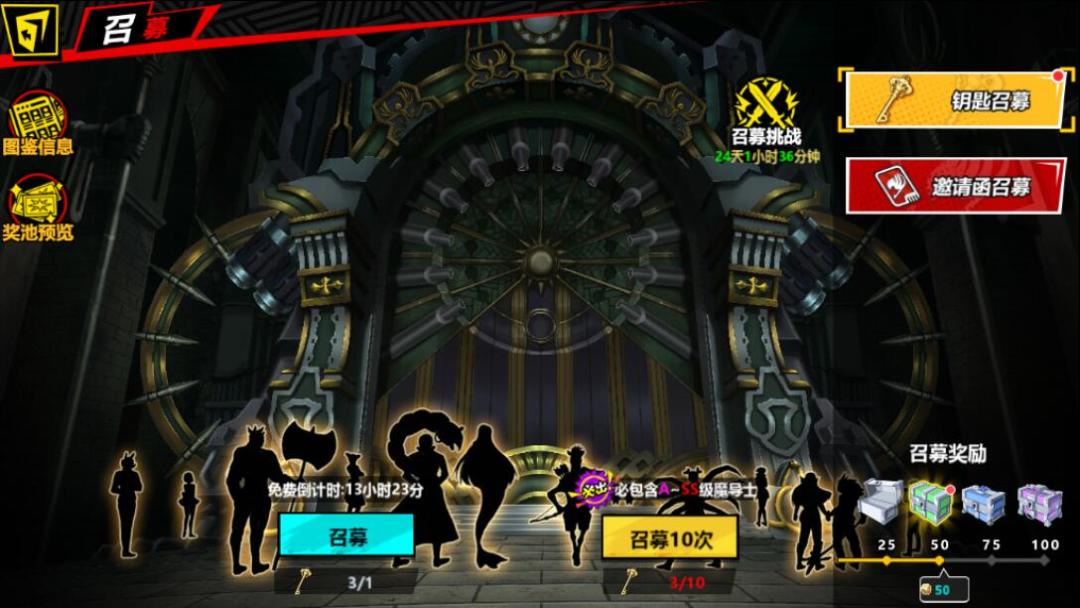 首先,玩家们可以直接利用钻石进行黄金钥匙的购买。大家准备好2500个钻石之后,可以直接到游戏的招募页面,点击十连招募功能,就可以成功的购买十个黄金钥匙。随后就可以将黄金钥匙使用在角色的招募上。