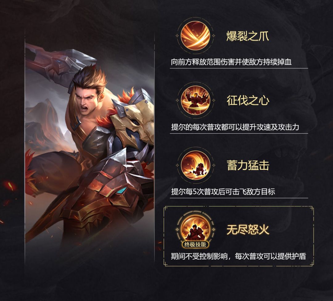无尽怒火:提尔的终极技能。获得免控状态20秒,期间普攻获得200(+300*技能等级)护盾,冷却30秒,护盾不可叠加。