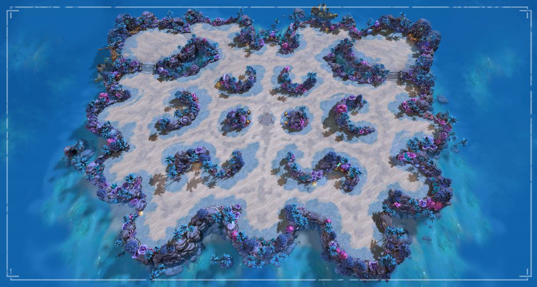 优美的蓝色圆弧组成了我们的新地图,左右对称,同时玩家基地位置固定就不那么考验玩家运气了,BOSS刷在地图中央对双方都公平,不易绕路偷家,这张图很依赖玩家正面交战赚战损滚雪球能力。