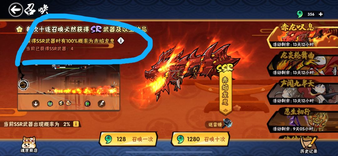 火炮,100%概率出的,260抽5金毛笔,100%概率出的,200抽6金