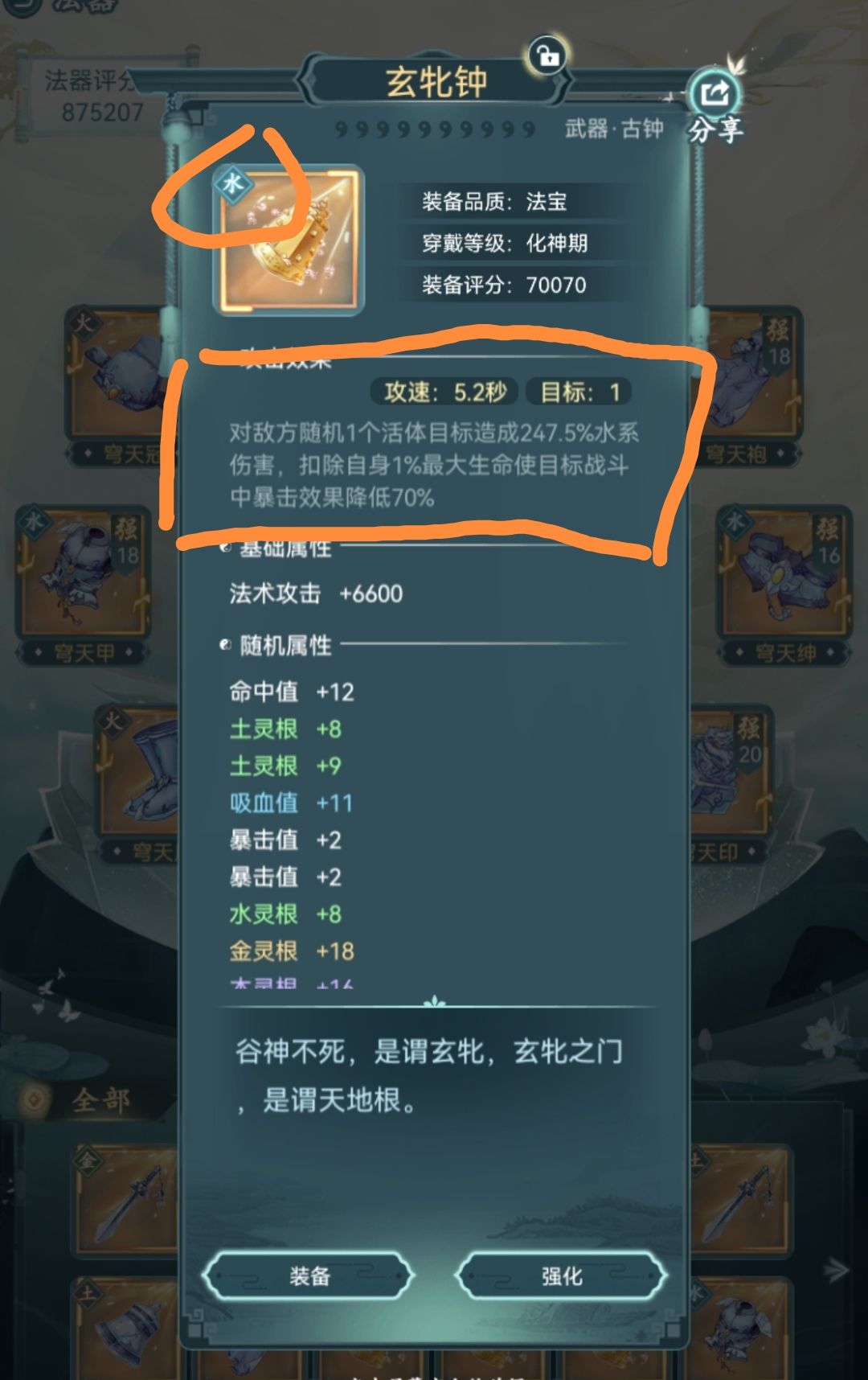 其次就是很多新玩家问,为什么灵根一直在变动,哪里可以加灵根数值,这里说一下装备和古宝!