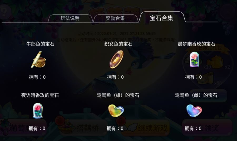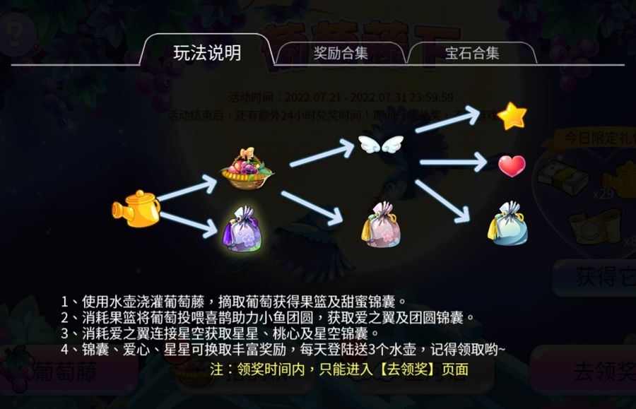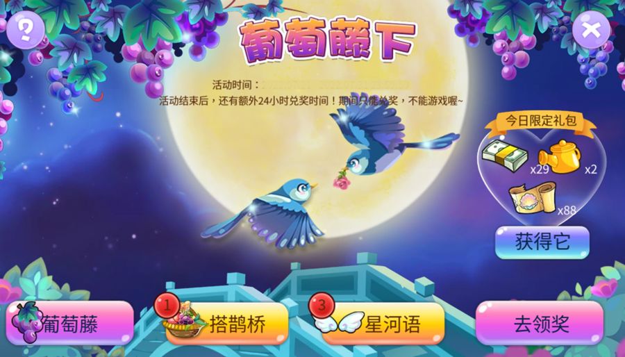 1、本活动分为五部分:葡萄藤、搭鹊桥、星河语、获得它、去领奖。<获得它>环节为可购买的限定礼包;