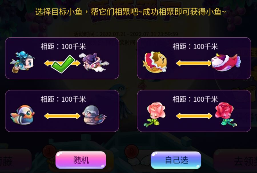 选择一对目标小鱼开始为它们搭建鹊桥,帮助它们成功相聚后可以获得其中鱼儿~