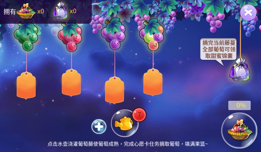 点击水壶浇灌葡萄藤使葡萄成熟,点击心愿卡去做任务来填满果篮。收集到果篮后就可以去下一个环节<搭鹊桥>啦。