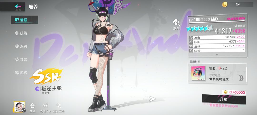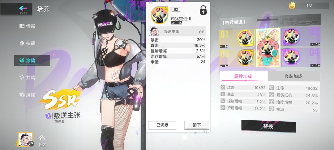 叛逆如果把共鸣开完的话除了输出墨迹之外,伤害是不低的,打魔方这种多回合副本吃香,建议是带一个防爆一个场外,另外一个位置可以带摇滚,发现一星A技能叠电,叠到五层后续电痕基本都是保持在12层,涂鸦带猪突猛进感觉也可以(主要是好刷😅),因为要发现A所以开大会很快,接近3w攻击叠满大概是在80w,暴击率不太够,伤害不稳定,涂鸦还得慢慢来。