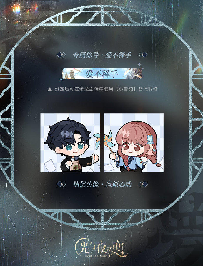 活动期间累计收信80次/120次/140次/160次/180次时,各可在限时计划处领取【情侣头像礼盒】,打开后可随机获得以下任意一组情侣头像:【风似心动】【千金一诺】【此间心悦】【玫瑰之名】【丹朱成念】(不会重复获得)。