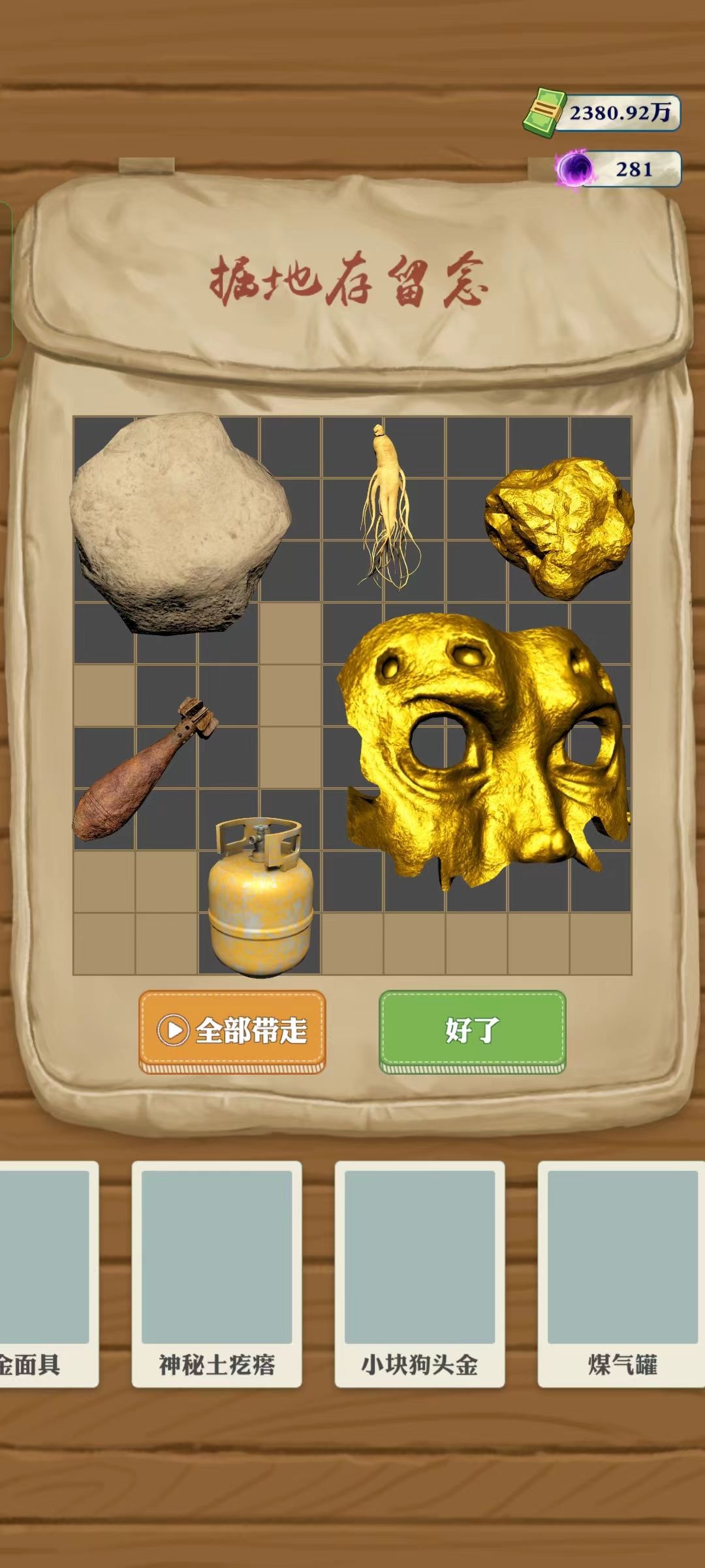 最后把挖到的宝藏进行打包,可以先安排上俩个角落的位置,再见缝插针加入细小的物品,酱紫就可以最大化的塞下物品带走啦~