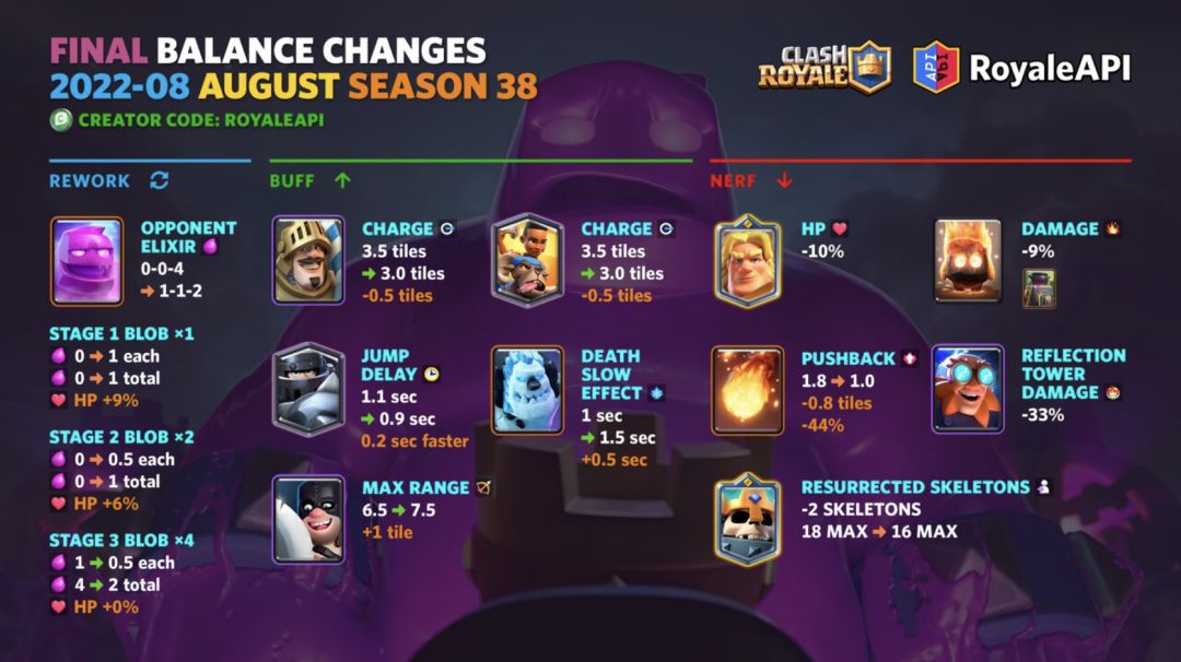 Supercell已经完成了8月份平衡性调整的修改。一切都和初稿保持一致,除了蛮羊骑士会得到和王子一样的加强——冲刺蓄力时间缩短。