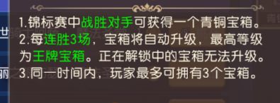 通过规则可知一定要打自己能打过的队伍(锦标赛中默认队伍为阵容1队),每次升出一个王牌宝箱立马解锁并暂停挑战,等箱子解锁后再进行接下来的挑战,这样能保证每一场战斗都兼顾生成箱子和升级箱子的作用。