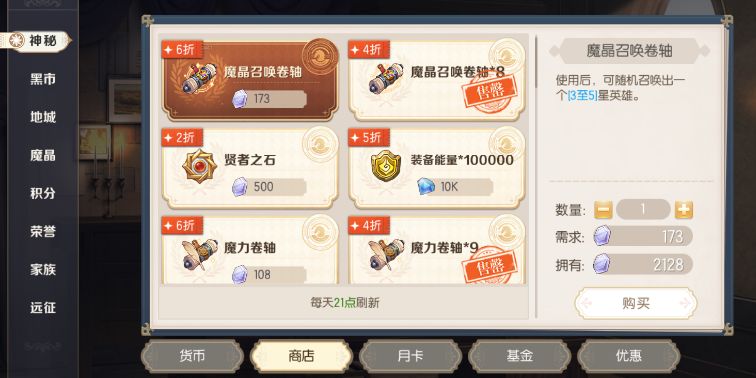 神秘需求购买的内容见抽奖和玩法篇,黑市中个人认为金币能买到的东西全买(不包括3星碎片和宝石召唤卷)。地城买空,魔晶跳过,积分荣誉家族远征商店视你培养进度需求购买。