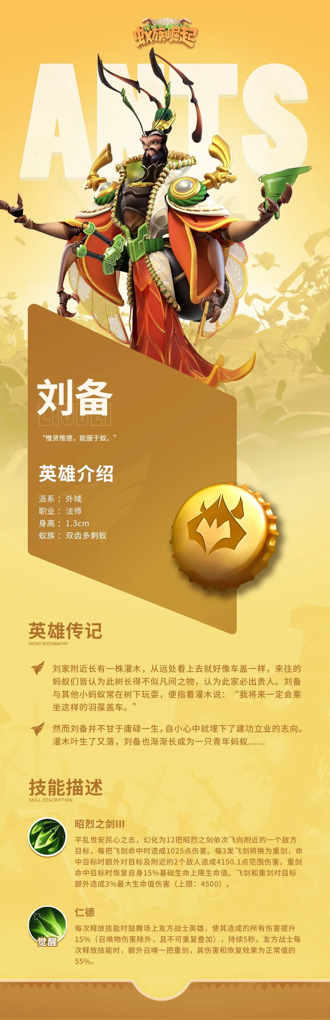 在各位眼中,刘备是怎样的人呢?仁慈?温柔?还是百无一用?这次推出的全新三国英雄“刘备”,设定和能力会颠覆你的认知!在其他作品中,刘备一般是数值平均的战士,或者是高端辅助,而在《蚁族崛起》里,他却摇身一变成为极具杀伤力和破坏力的暴力法师!超强的攻击可以让你在各场战役中无往不利!