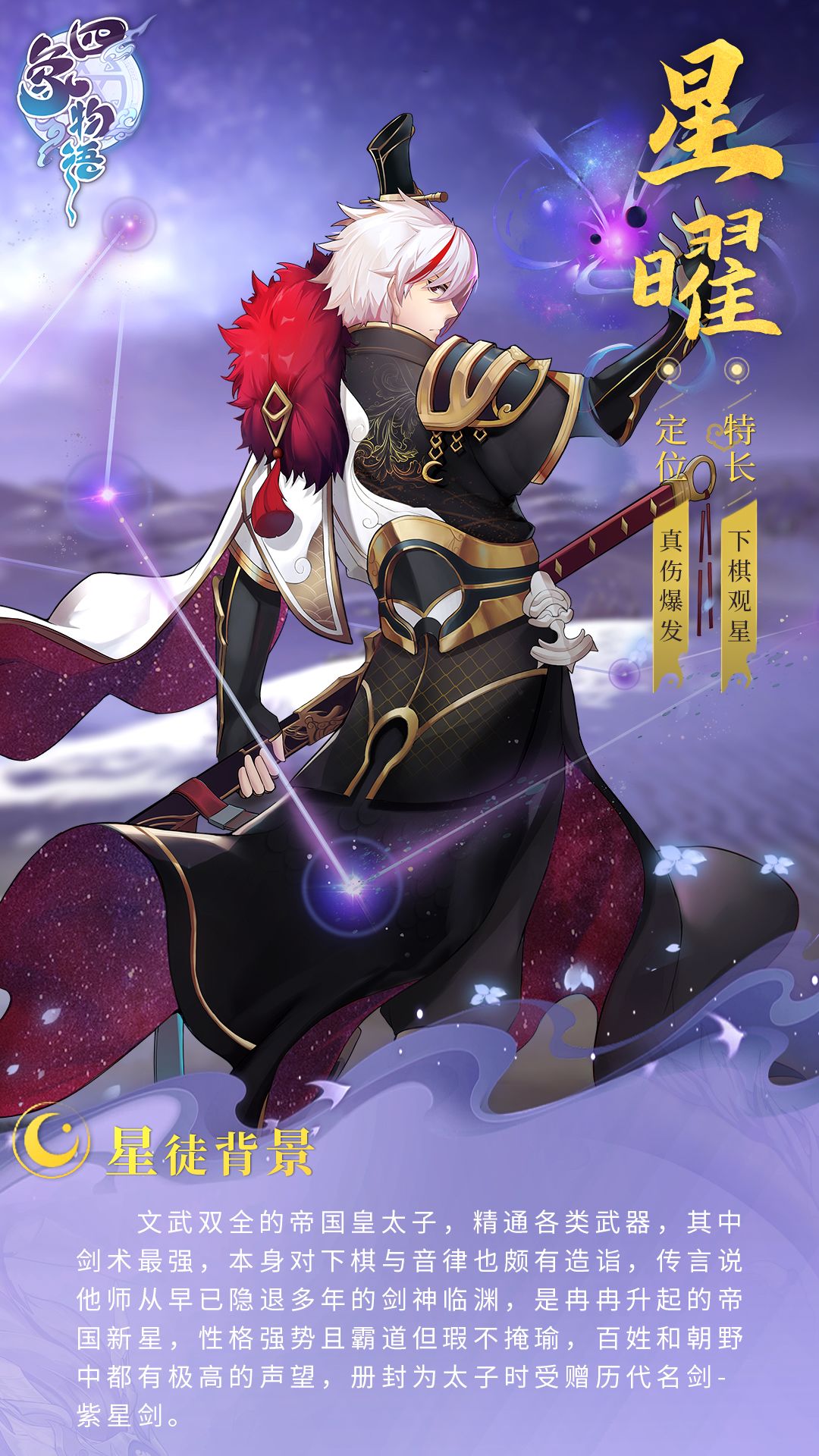 文武双全的帝国皇太子,精通各类武器,其中剑术最强,本身对下棋与音律也颇有造诣,传言说他师从早已隐退多年的剑神临渊,是冉冉升起的帝国新星,性格强势且霸道但瑕不掩瑜,百姓和朝野中都有极高的声望,册封为太子时受赠历代名剑-紫星剑。