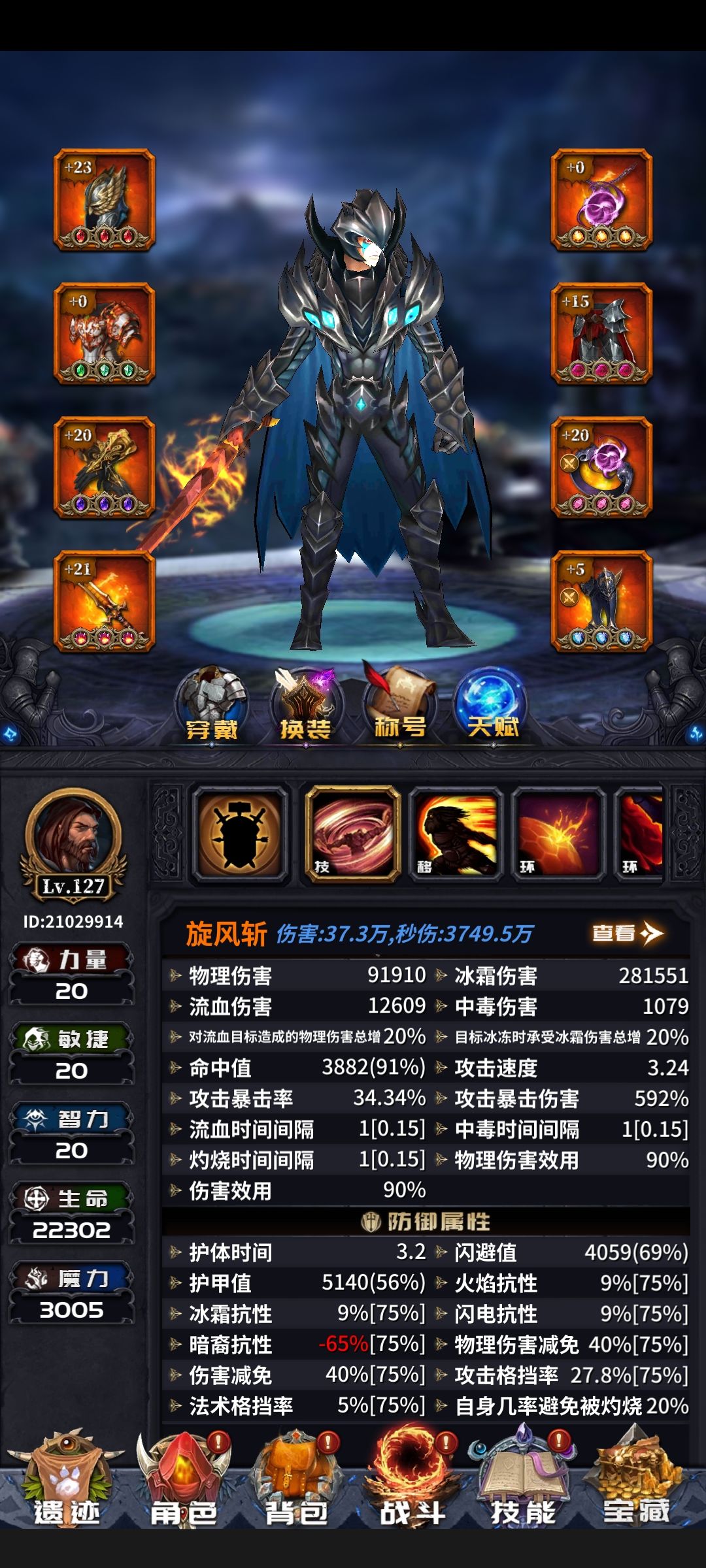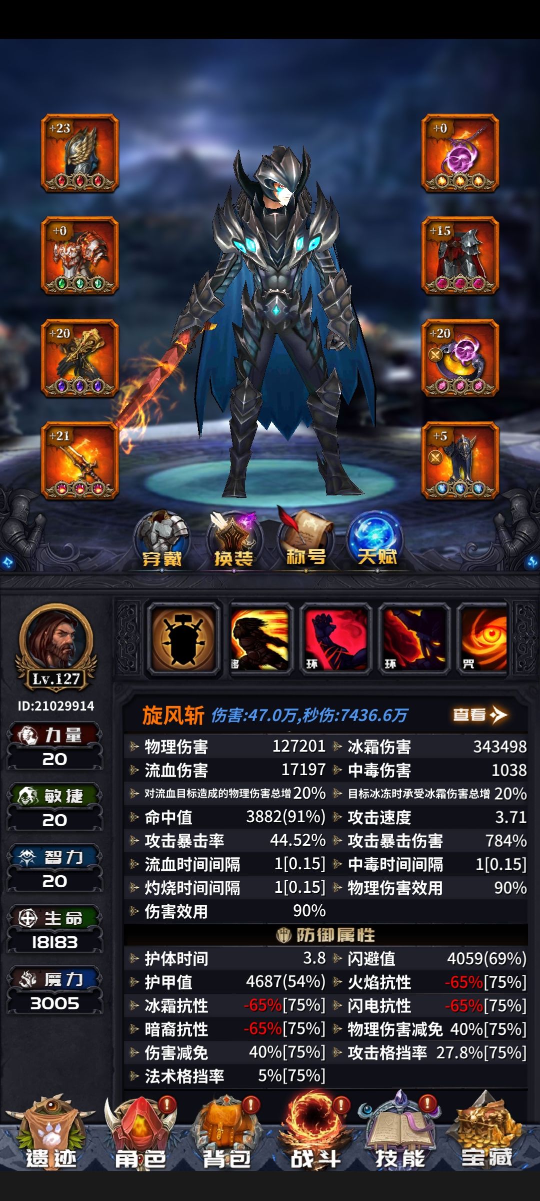 再说一下装备,也是因为懒得刷词缀,全都是用的115橙装,一件紫的都没有。至于刷橙装,用的离线刷紫色幻境,在线挂神碑,手动刷橙色和蓝色升的紫色幻境,爆率挺大的。最主要的原因是115橙装里面的护体加成特别适合冰风车。