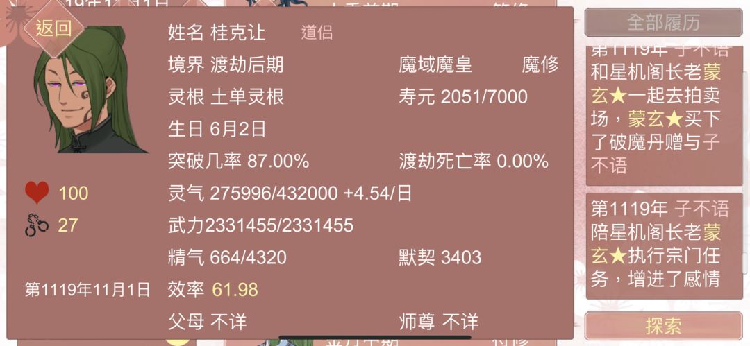 本来是为了刷元阳一直在杀魔域城主玩,结果看见了黑皮粉眼的小老公没下的去手,臭屁的剑尊早就和别的女人结婚,一股火给杀了,我和城主鱼只是偶遇,点开发现人家还是有元阳的,总在我眼前晃悠,其实不缺元阳了,但是没忍住挂在他身上,又是磕药又是磕符的,他的死亡率很高需要一直注意,愁死我了,第一周目最爱的鱼,现在顶着高修练度和他耍魂契,好累啊,但是又真的喜欢他。