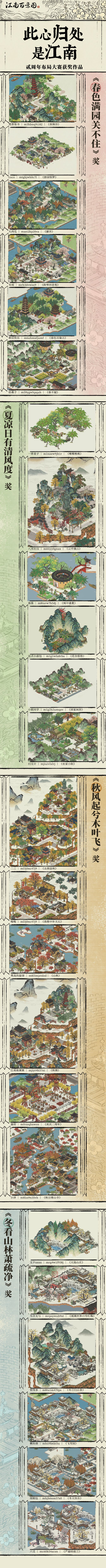 贰周年布局大赛现已结束,感谢各位参赛知府们的用心和巧思。根据投票结果,现将四季主题获胜布局作品展示如长图所示。