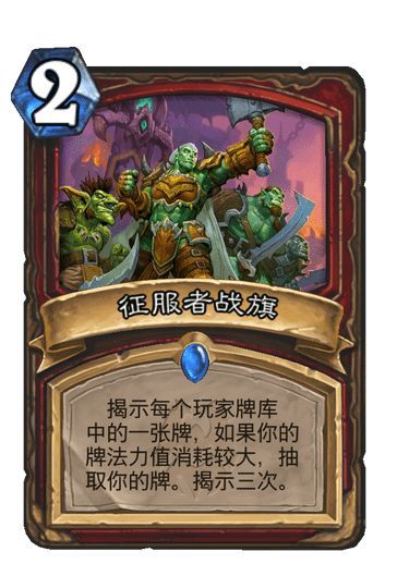 说实话,我根本不知道这张牌能有什么作用,作为一张2费的过牌,这张牌是不合格的。2费的纯过牌(定向检索除外)一定要尽量稳定的抽至少两张牌才能进构筑,比如猜重量,狂怒之嚎等等。而征服者战旗明显的弱了。下限太低,上限就算触发,也能让对手看你的三张牌。而且一般需要这种轻型过牌的卡组,都是中速偏快的卡组,这类卡组的曲线不可能高的。