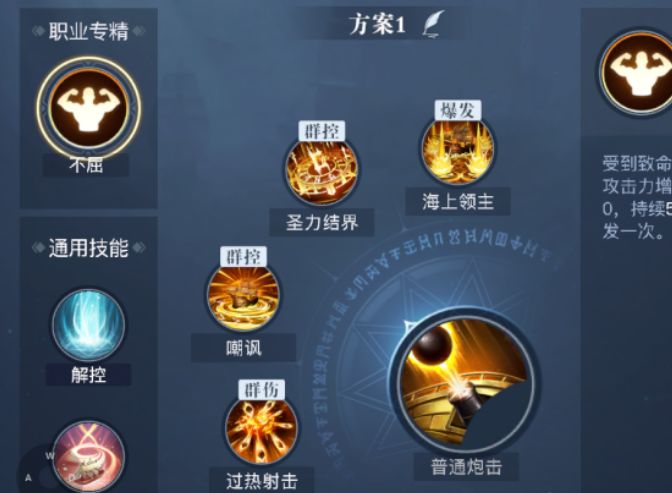 自定义技能搭配:“不屈”+“过热射击”+“嘲讽”+“圣力结界”+“海上领主”。