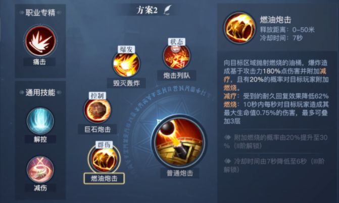 技能搭配推荐:“痛击”+“燃油炮击”+“巨石炮击”+“毁灭轰炸”+“炮击列队”。