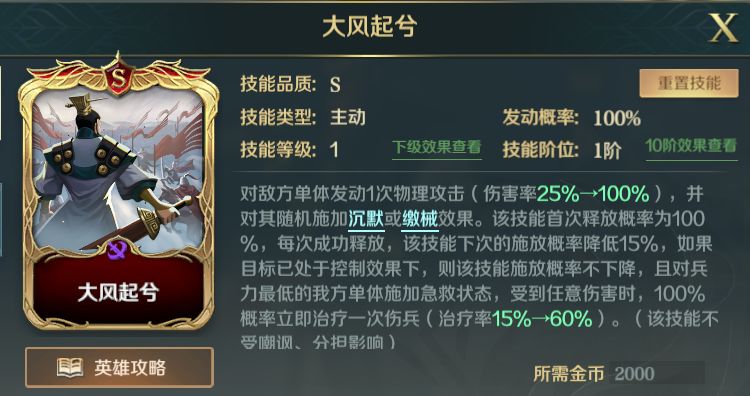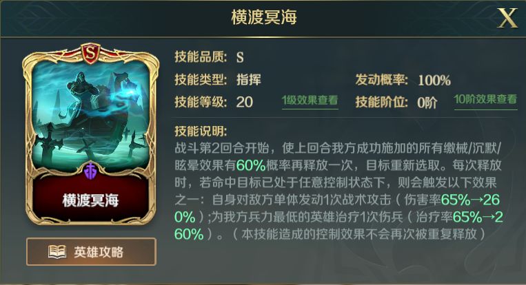 首次释放100%单体控制,特定条件下不降低发动概率, 定向对兵力最低单体施加急救效果,获得一次60%治疗。