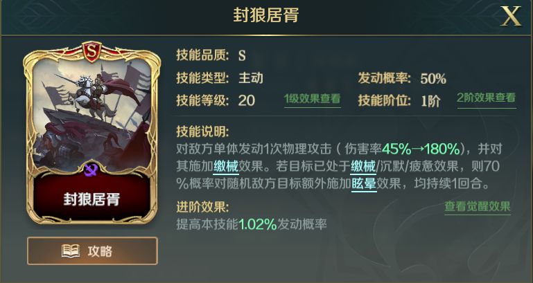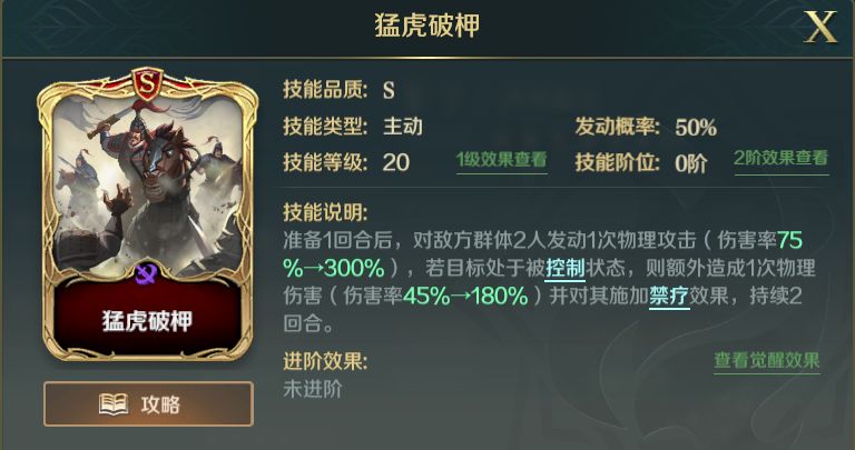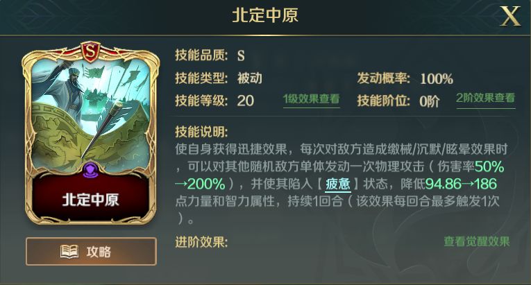 敌方有1/2/3人处于缴械/沉默/眩晕/疲惫状态,临时提升力量20%/35%/45%,再对敌方2人造成250%物理伤害。