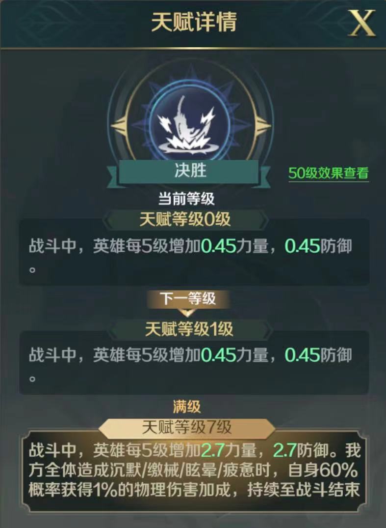 战魂项羽决胜:我方造成沉默/缴械/眩晕/疲惫时,自身60%概率获得1%物理伤害加成,持续到战斗结束。