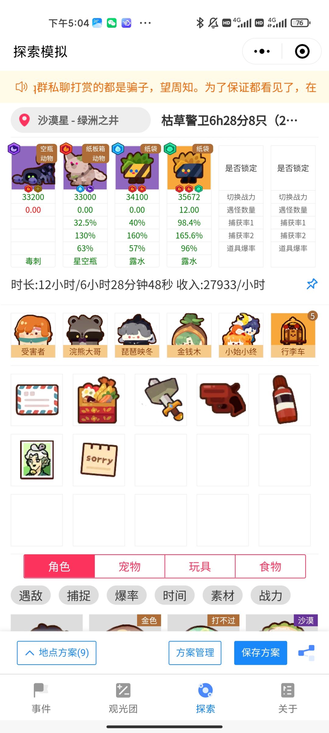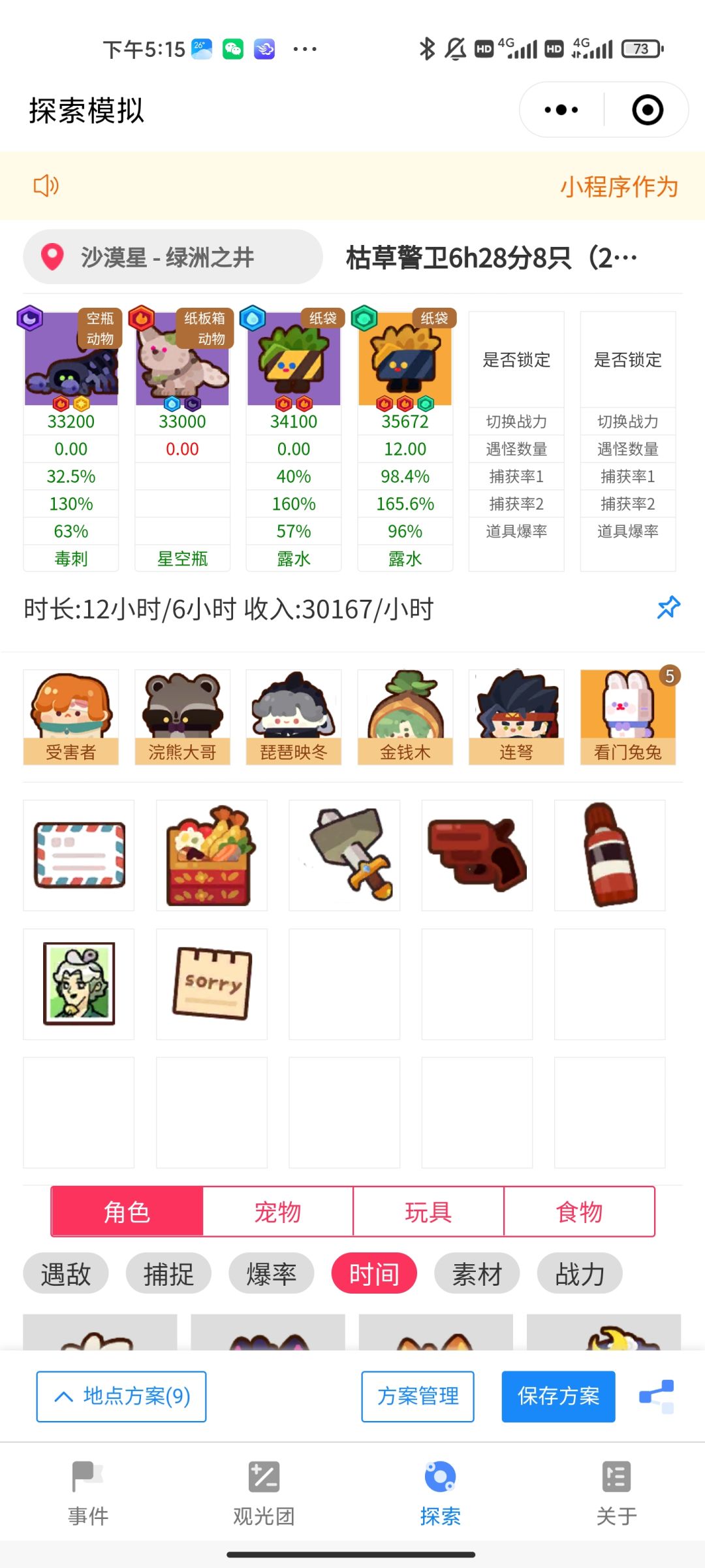 我自用的方案6h28分捉8只,二级工具捉捕成功率98.4%,直接看图吧。