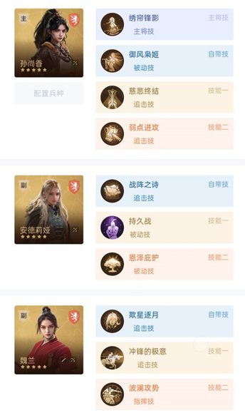 这套阵容战斗力还不错,主要优点在于对平民比较友好,对武将的要求是安德莉娅一星以上即可,其他随意。技能里面持久战+恩泽是固定搭配,如果没有恩泽庇护就不建议这么玩了。