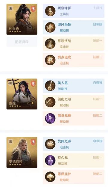 剩下的四位英雄里面,魏兰和安德莉娅都很需要连击效果,虞姬可以给她们打辅助,形成孙尚香+虞姬+魏兰/安德莉娅的双核阵容;此外,铁尉迟在到达三红以上后,全军增伤效果也非常可观,可以替换掉单体辅助的虞姬,形成孙尚香+铁尉迟+魏兰的纯输出阵容;或者也可以对安德莉娅的治疗效果加以利用,组一套坦度不错的半肉弓。下面做详细说明。