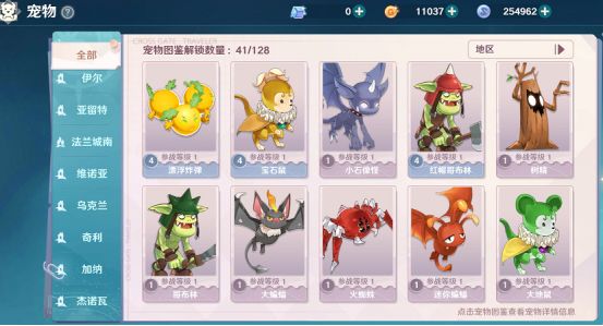 目前宠物的数量非常多,从图鉴可以看出有128种等待解锁,且分布在不同的地图,伴随着升级,全都有机会遇到哦。