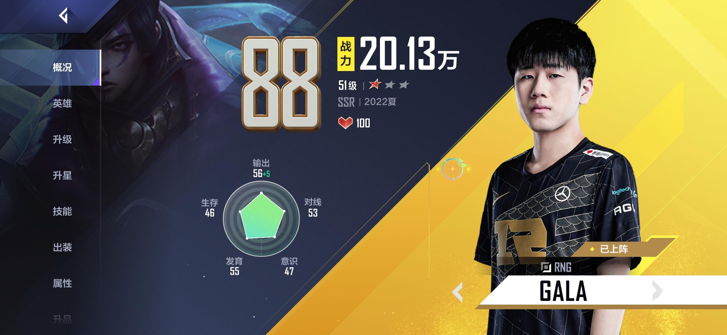 氪了六块,rng队套,大爹gala二十万战力全靠它,战力六十二万,现在峡谷之巅大师感觉上不去王者了,大师分段基本个个战力都比我高!我觉得这游戏还行吧,主要我就冲了六块钱,慢慢玩主要心态要放好,不要对这游戏有太高的期望!不充钱就当养成游戏一样每天做做任务就行了!砖石以上好像不是同战力匹配是根据你段位匹配给你战力差不多的,如果你段位太高战力低,那你就会发现,把把对面比你战力高十几二三十万!