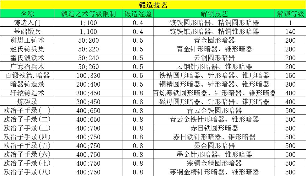 锻造技艺这里只标注了琴与暗器的,这些书籍原本包含的其他兵器并没有写入。