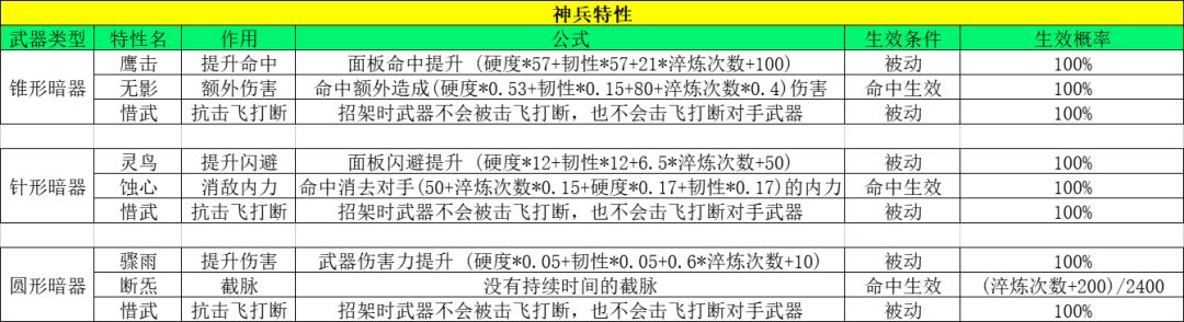 暗器的神兵特性:目前暗器有三种,实战效果以及实用场合暂时还没有去尝试,玩家请自行摸索。