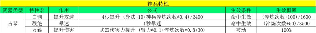 琴的特性,目前琴只有一个神兵,不需要计算重铸,但选择单一,以后有望增加新的琴类神兵。
