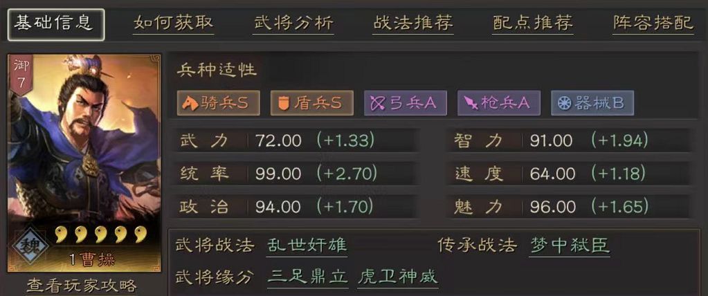 3、曹操,可以说光听这个名字就知道他一定是游戏中的核心武将了。我们可以看到曹操的属性面板,就算是白板曹操属性也都是很高的,更别说成长起来的曹操了。曹操属于一个万能的辅助武将,基本上可以说的无人可替的。