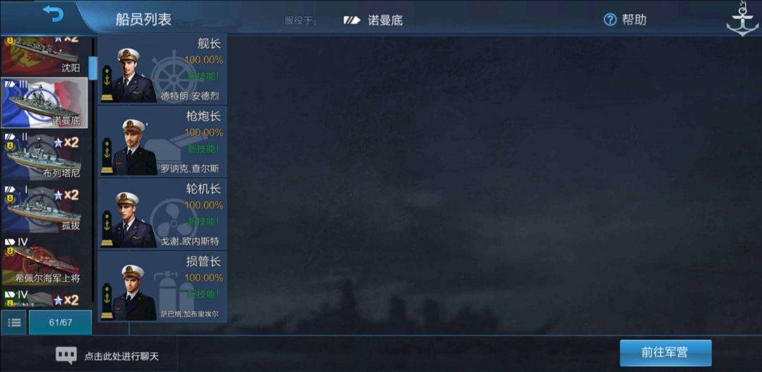 然后我们开着诺曼底去打一局。打完回到船员界面,再次查看舰长的技能: