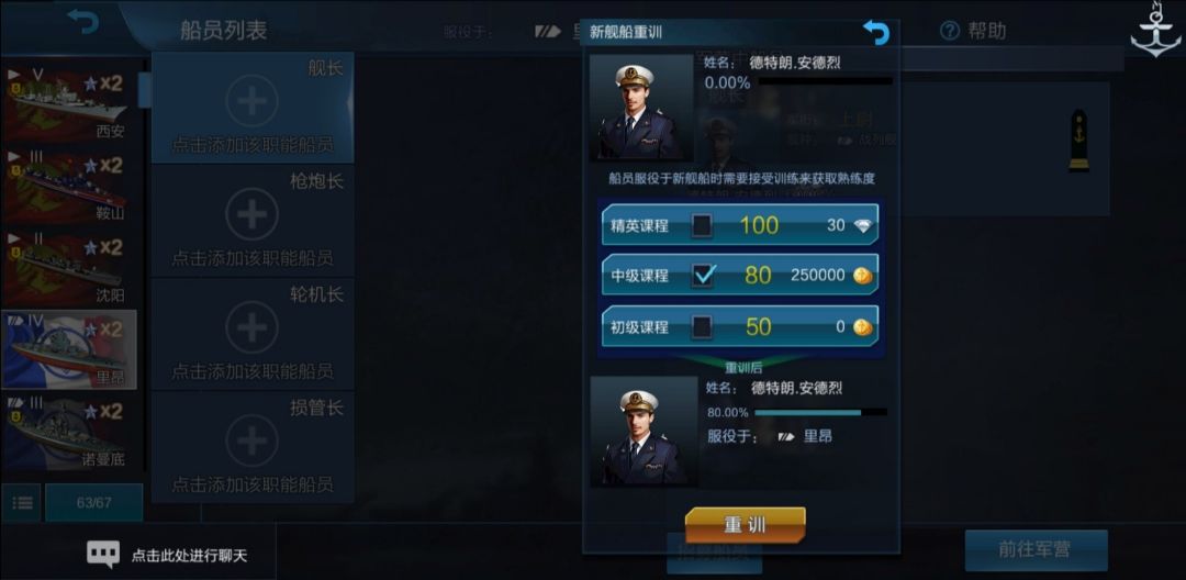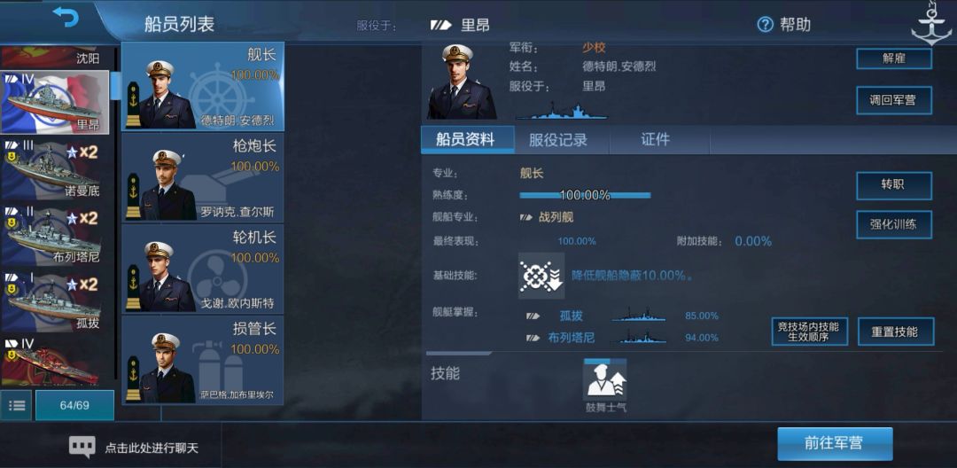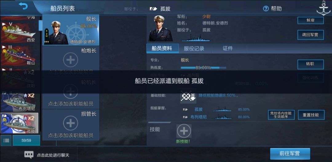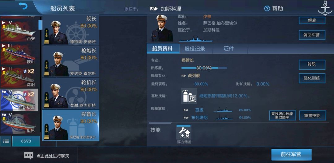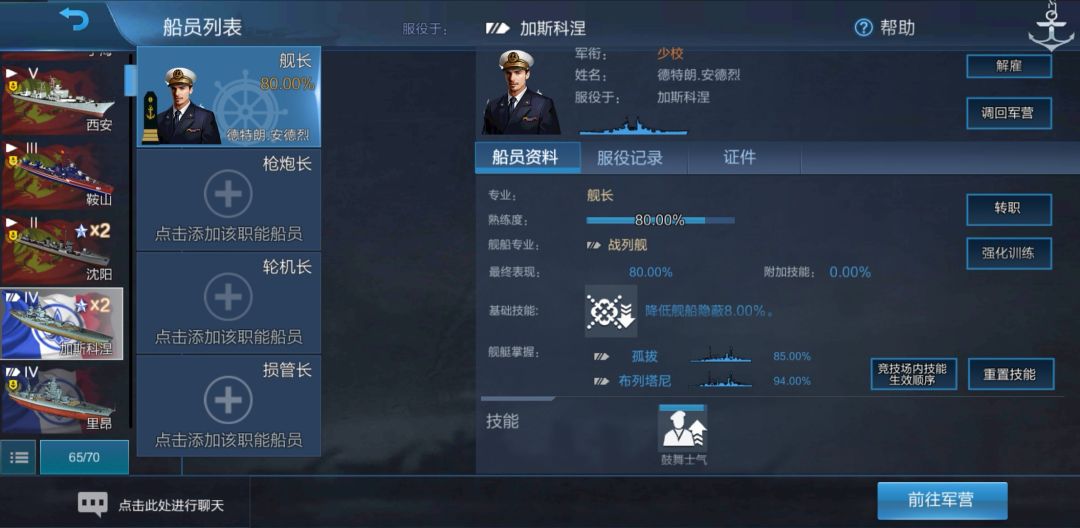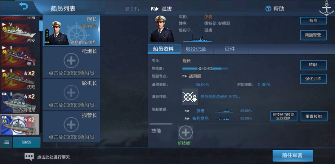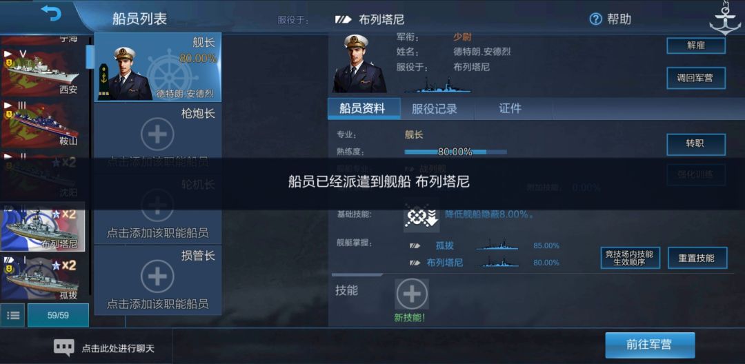 可以看到,舰长的熟练度变成了对应的80.00%,但是舰船掌握却写着“孤拔 85.00%”、“布列塔尼 80.00%”。我们将舰长调回军营: