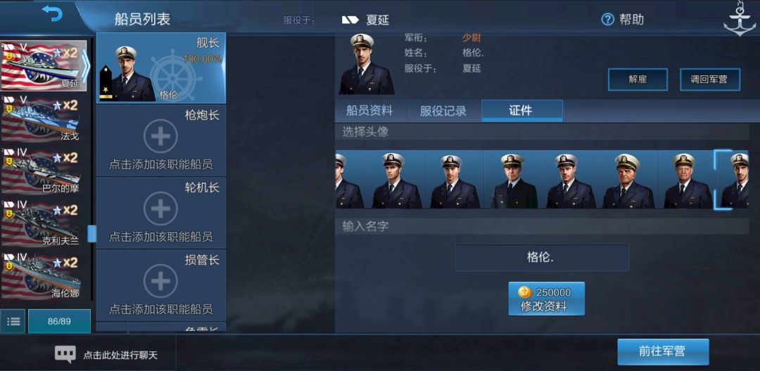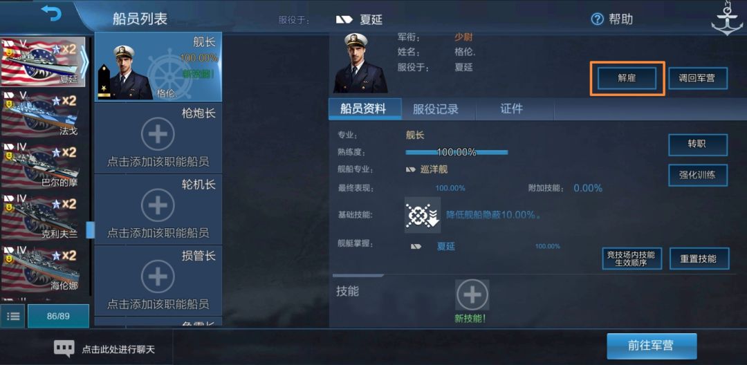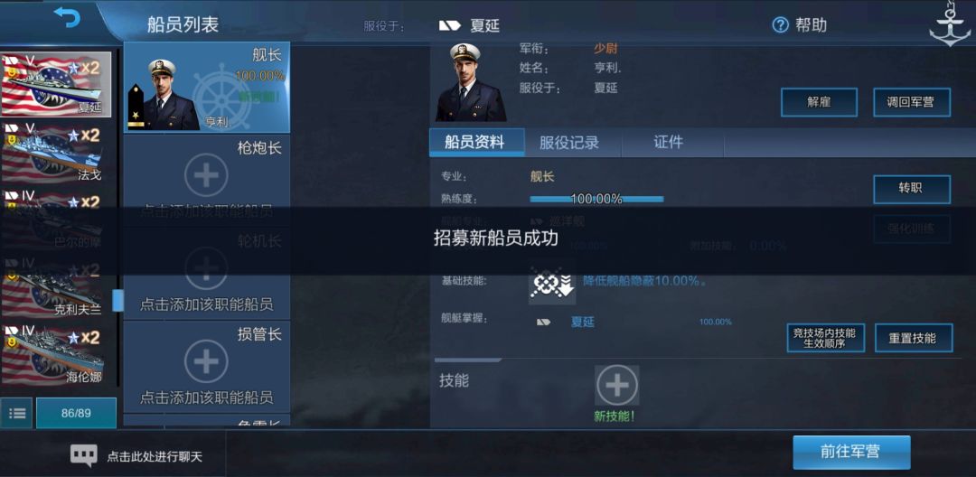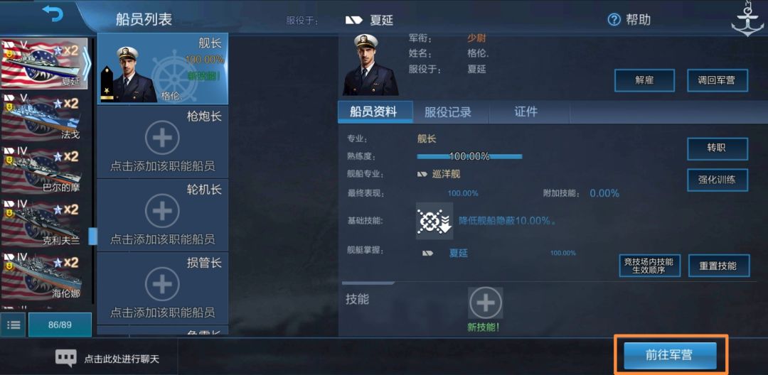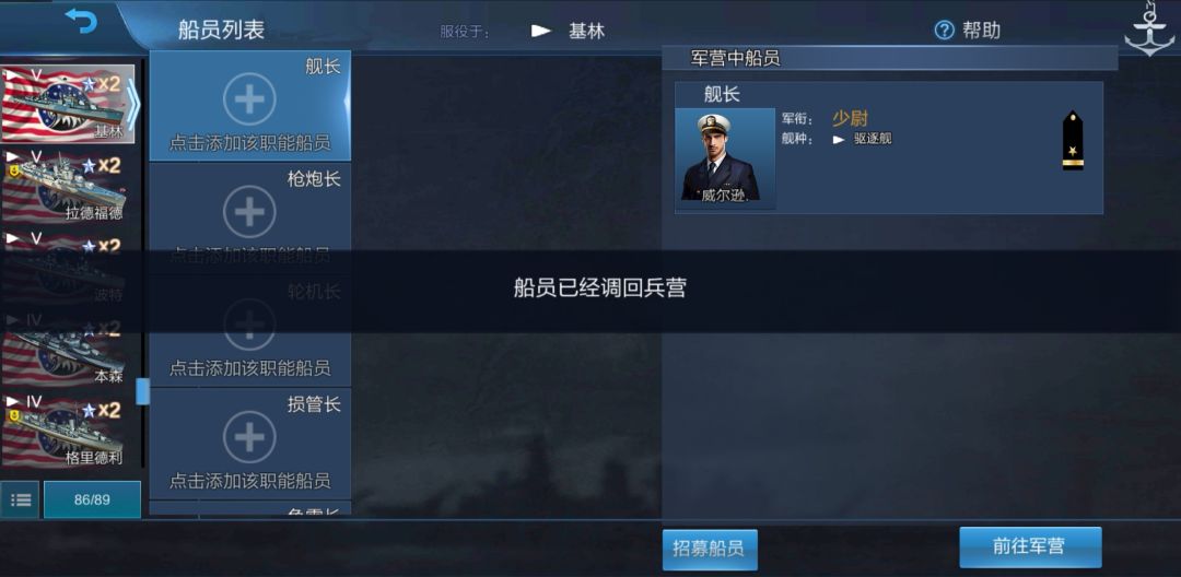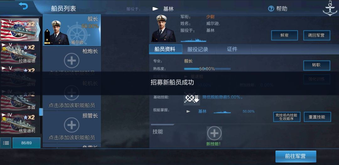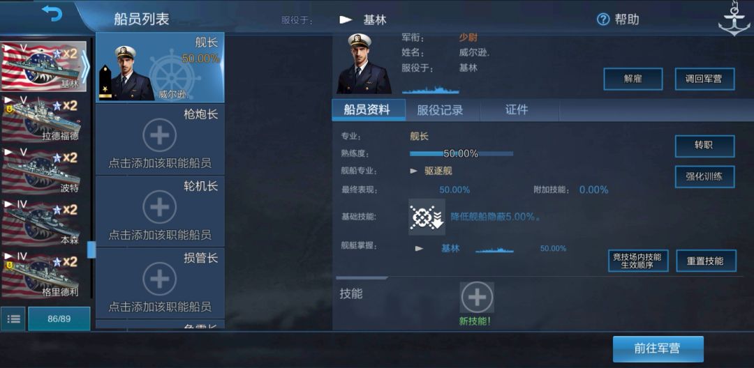 我们获得了一个在基林上熟练度为50%的美驱舰长。现在我们把他调回军营: