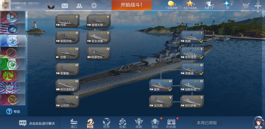 熟练度已经提升到了85.00%,其他一些数值也发生了相应的变动。我们现在去科技界面,点击第二艘船布列塔尼: