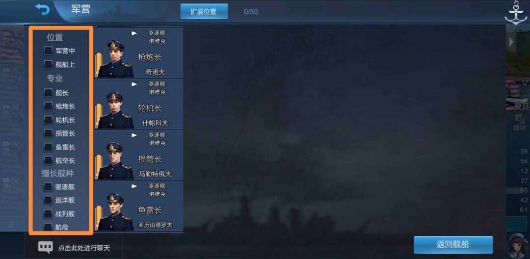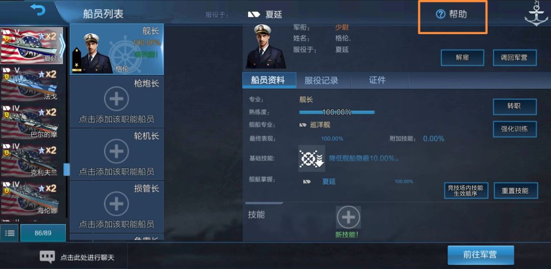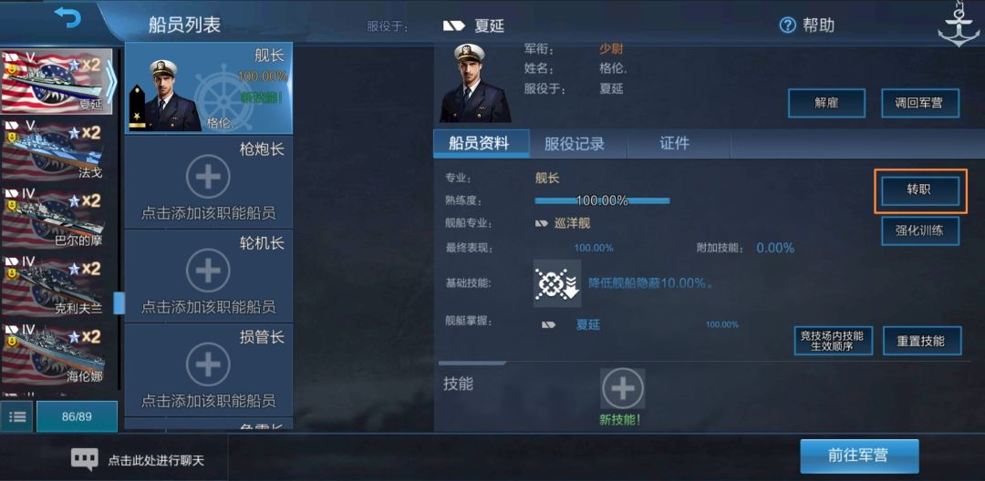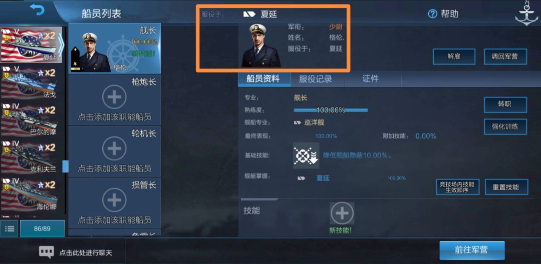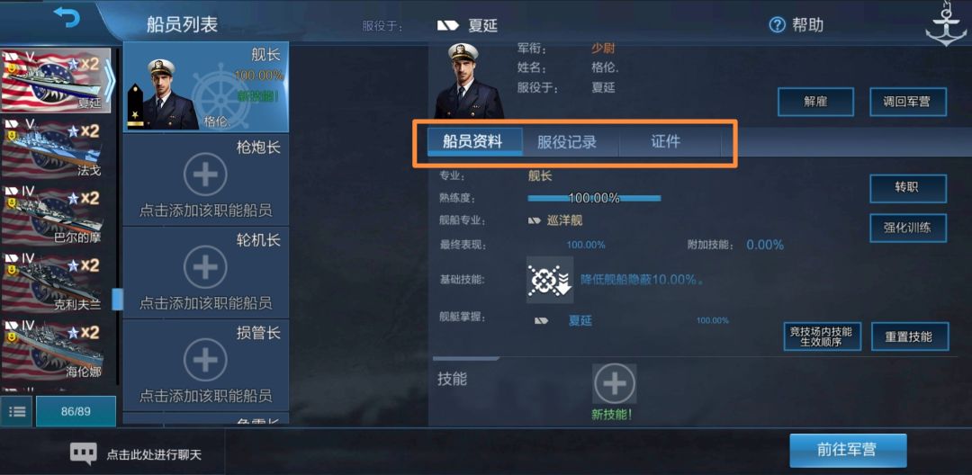 没有出现重训界面,而是直接变成了100%熟练度,这就是我们之前看到的“船员熟练度初始值100%”。我们可以看到,该舰长舰船专业依旧为驱逐舰,即他仍可以用于美驱线船,但并不因为其在夏延上服役过就可以用于美巡线船。为了检验,我们把他调回军营,并打开其他舰船的船员界面,点击舰长: