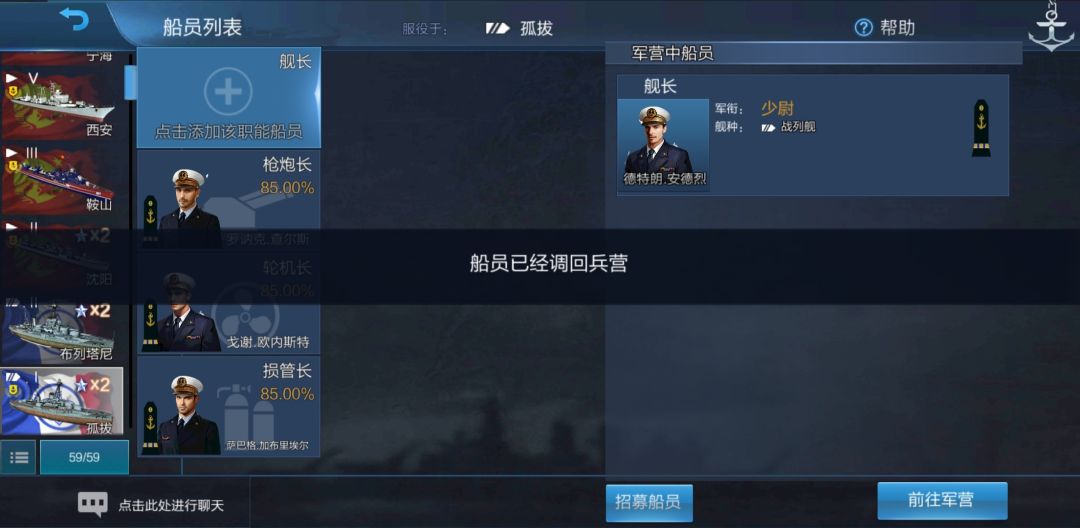 右侧的“军营中船员”列表中出现了我们刚才从孤拔上调回军营的舰长。我们点击这名舰长: