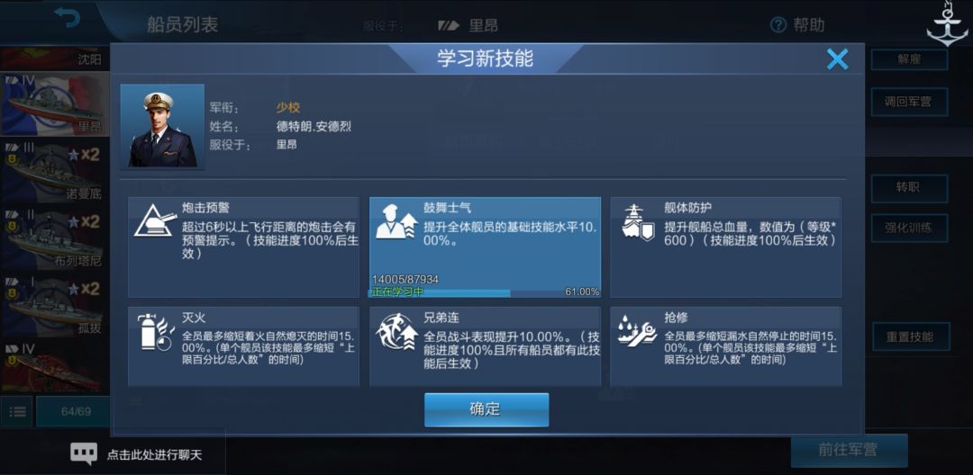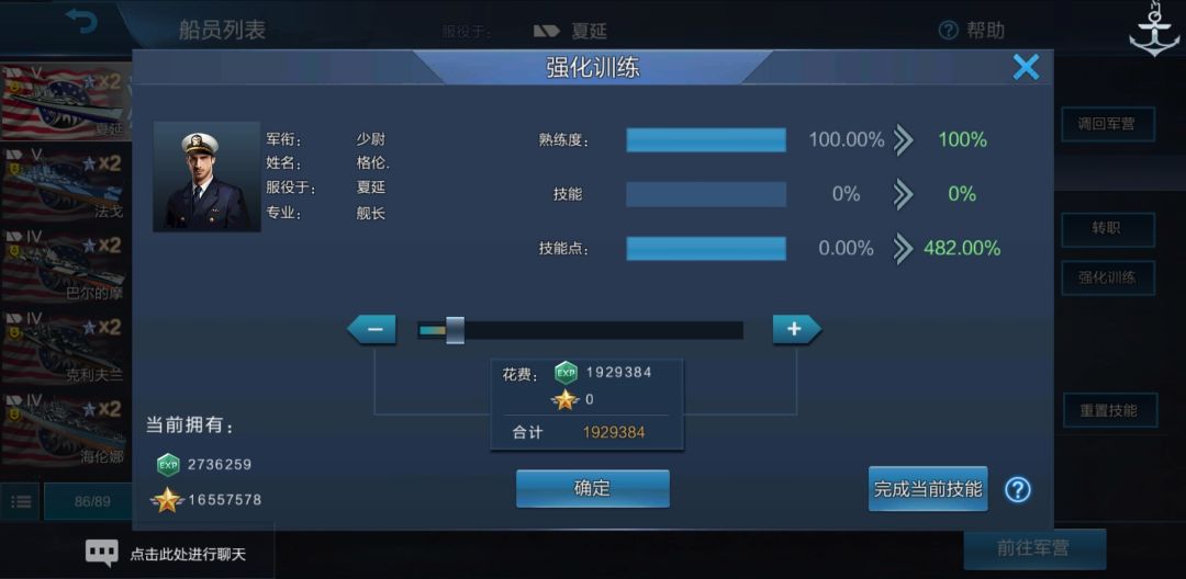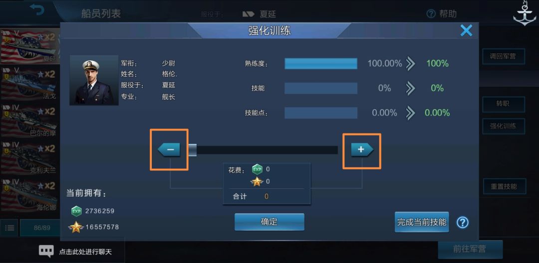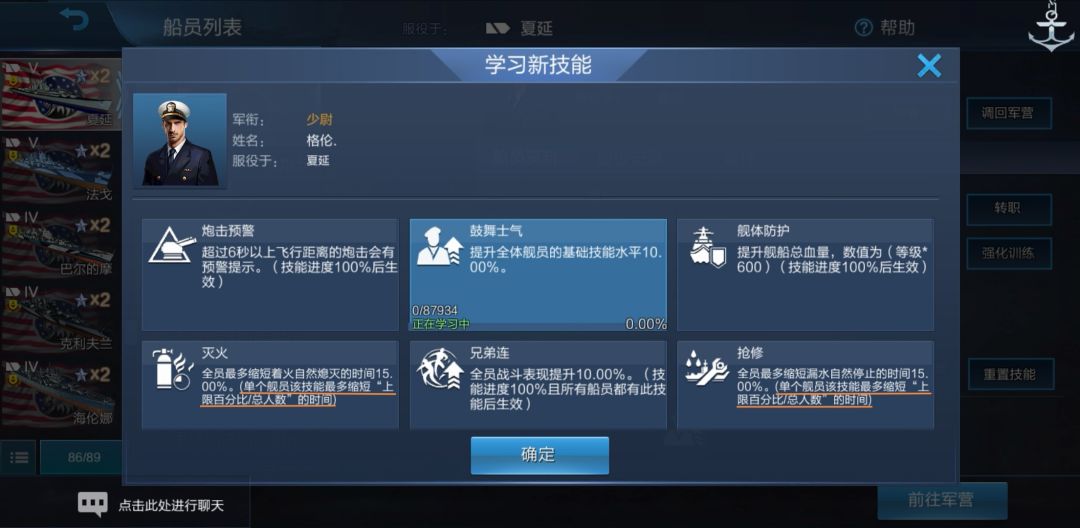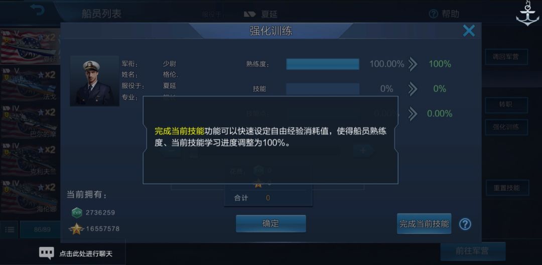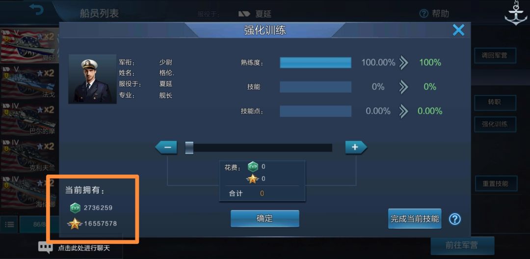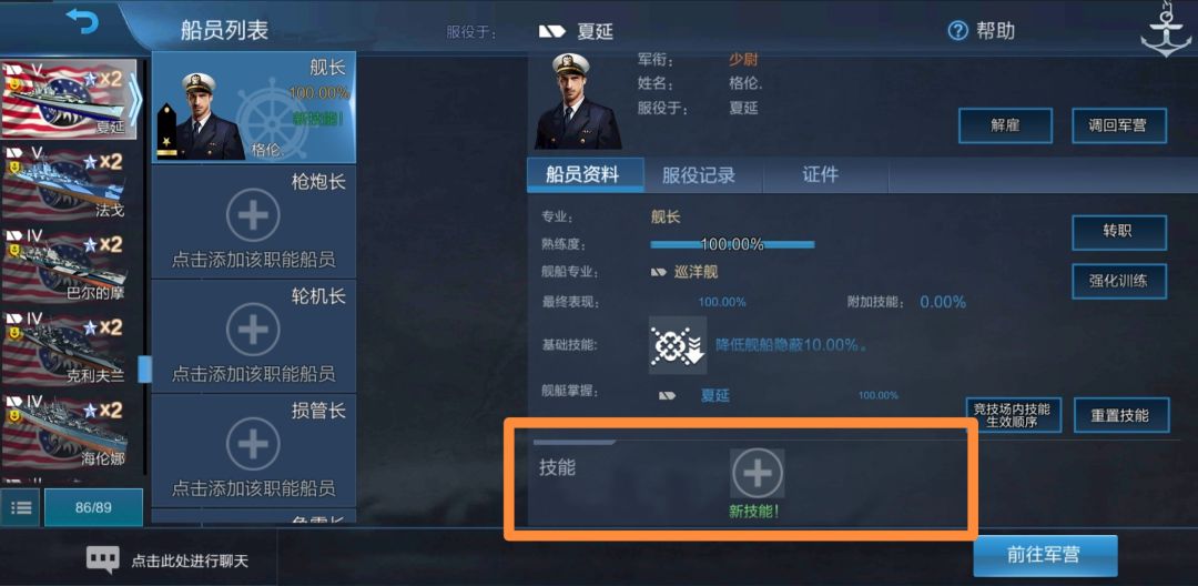 所有船员熟练度都达到了100.00%,同时熟练度下方出现了“新技能!”字样。我们点一下舰长: