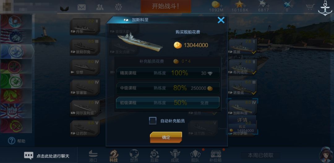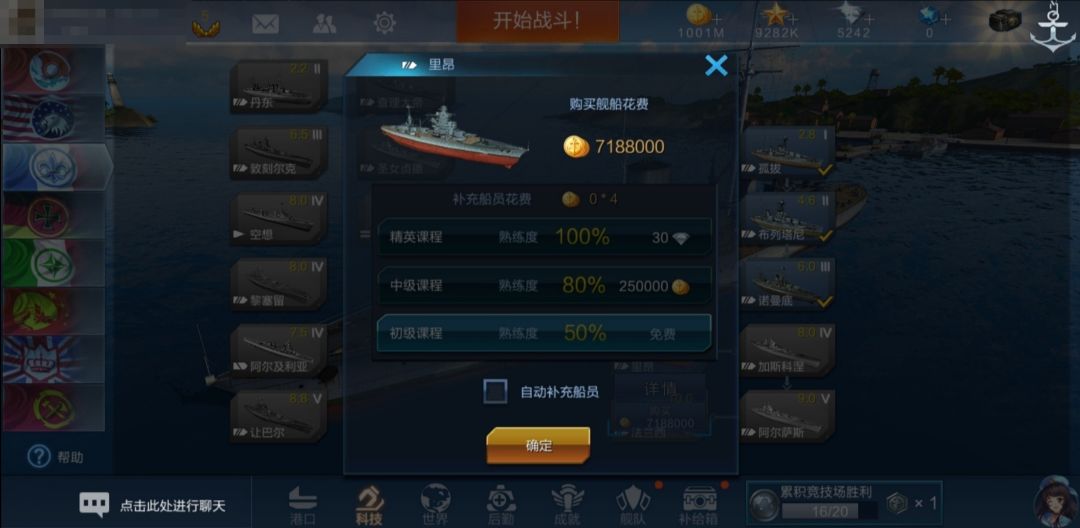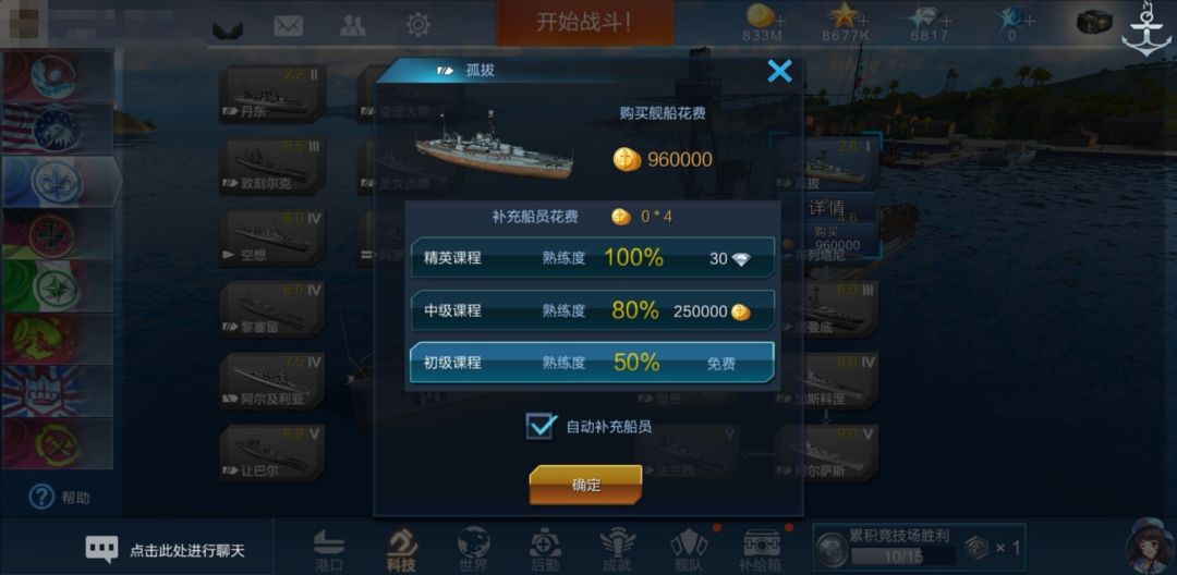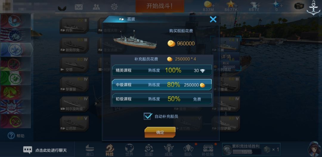 此时,系统会提醒我们是否要自动补充船员(默认勾选)。若勾选自动补充船员,则有三种级别的课程可供选择,每种课程获得的熟练度和消耗的资源都不一样。我们保持勾选,并选择获得熟练度80%,消耗花费25w金币/人的中级课程:
