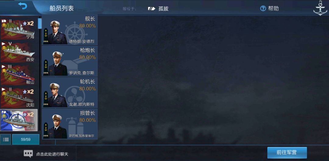 可以看到,孤拔上出现了四名船员,分别是舰长、枪炮长、轮机长和损管长,而且在职位的下方都出现了一个相同的数字80.00%,这个80.00%就是我们刚才所选的中级课程提供的熟练度。我们点击其中一位船员,会出现单个船员的详情界面,比如我们点击舰长: