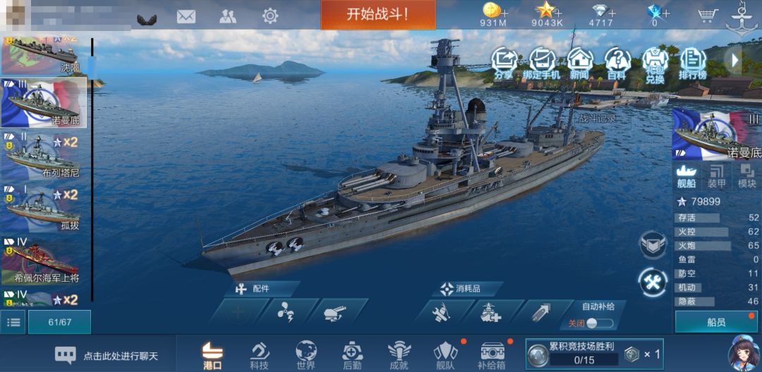 和之前一样,对应的数值提升了,但还没到100.00%。我们去科技界面购买下一艘船——诺曼底,同样不自动补充船员: