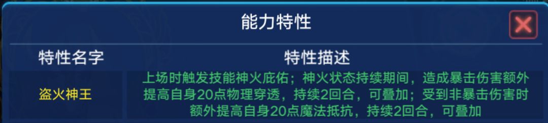 ①专属特性-盗火神王上场会自动触发二技能。如果能够保证暴击,而且能抗的住对面的伤害,龙马后面就不用再开二技能。